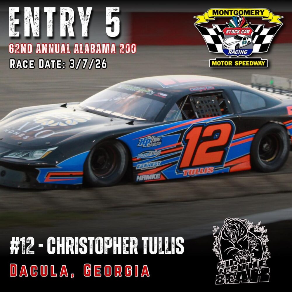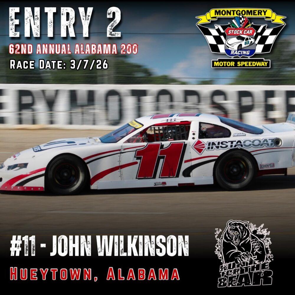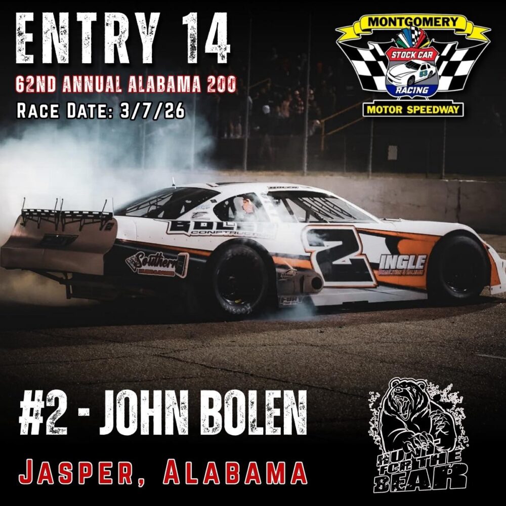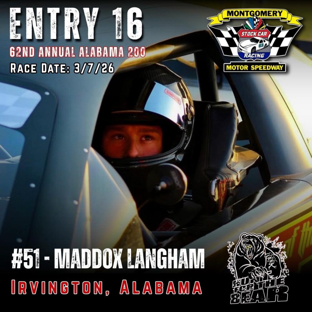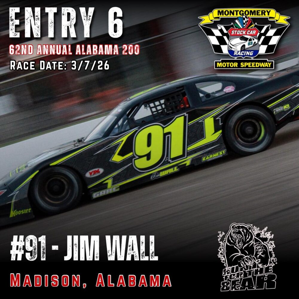 The 62nd Annual Alabama 200 is set for March 7th, 2026 at Montgomery Motor Speedway. As one of the premier Pro Late Model events in the country featuring 200 laps of hardcore side by side racing and a payday of 10k to the winner, the ALABAMA 200 “Hunt for the BEAR ” is one you don’t want to miss.