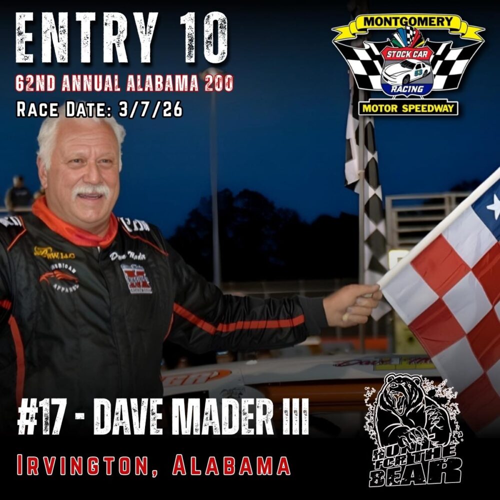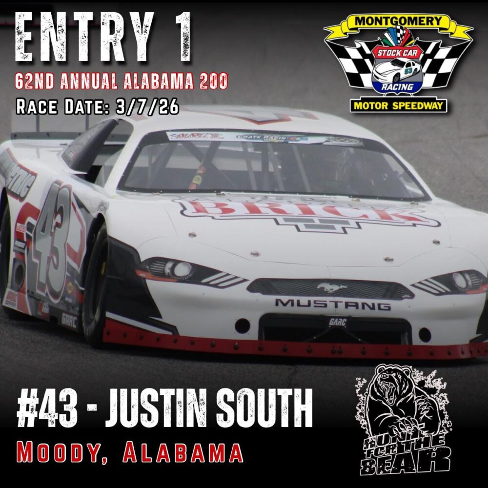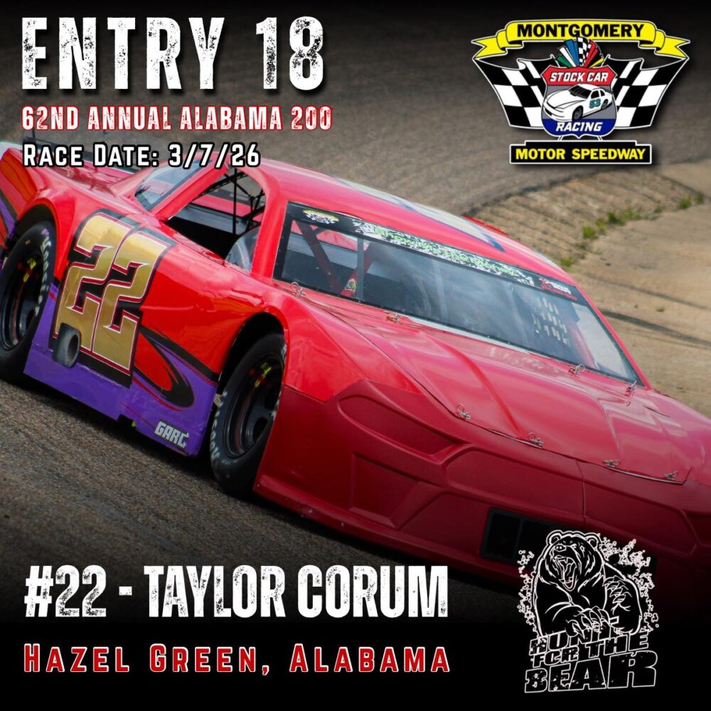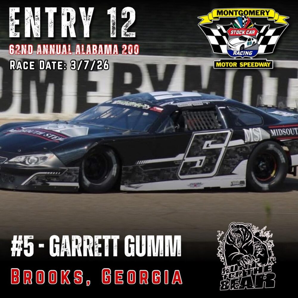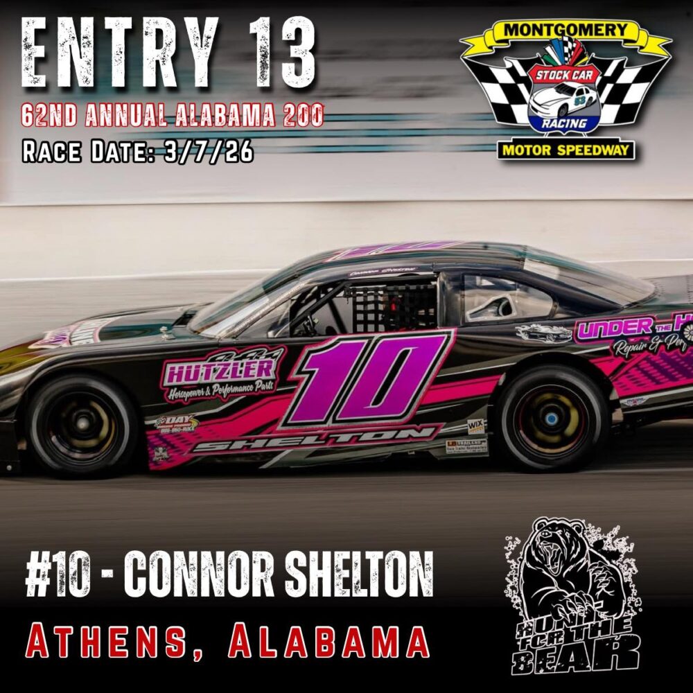 The 62nd Annual Alabama 200 is set for March 7th, 2026 at Montgomery Motor Speedway. As one of the premier Pro Late Model events in the country featuring 200 laps of hardcore side by side racing and a payday of 10k to the winner, the ALABAMA 200 “Hunt for the BEAR ” is one you don’t want to miss.